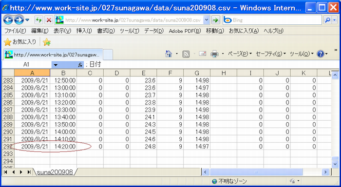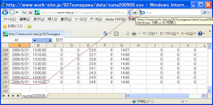 | ■症状 観測データの数値ファイルを、ダウンロードして開いた場合、前に画面を開いたときの古いファイルが表示され、最新のデータが表示されない。 ■原因 インターネットでは、通信データを減らし、表示速度を上げるために、前に画面表示したファイルを一時的にディスクに保存し、次にこのファイルが呼ばれた時に、その保存されたファイル(キャッシュと呼びます)を再度表示する機能があります。 この一時保存データは、パソコンやインターネット通信経路に点在し、一定時間ごとに更新されていきます。このため、最新のファイルが、末端のパソコンに届くまでの時間は、20分から2時間くらいで、通信経路やパソコンの設定によって変わります。 画像の場合は、「最新の情報に更新」のアイコンをクリックしたり、「F5キー」を押すことで、強制的に、最新画面を表示させる機能がありますが、ファイルのダウンロードの場合、このようなボタンはありません。 根本的な、対策は、監視センタ側で、毎回ファイル名を変えて、データを保存することです。 ●現状は現場名+年月 「Field200908.csv] → 年月日時分「Field2009081250.csv] ただし、この場合、監視センター側のデータファイルの管理が複雑になるので、すぐには対応できません。 そこで、当面の対策として、最新ファイルを急いでダウンロードする場合は、 を以下の手順で対応をお願いします。 |