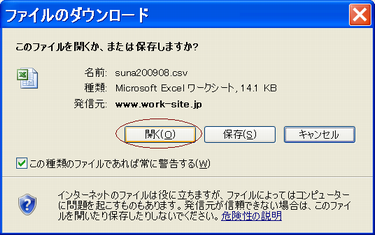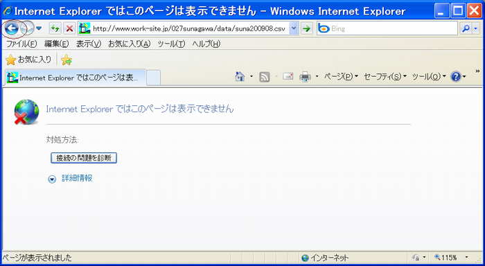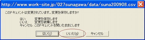 1.データファイルを開きます。 最新データが表示されない場合、「移動ボタン」を押して、同じファイルを読込ます。 ![]() 2.今に表示している画面の、保存は不要なので「いいえ」 ![]() 2.ファイルのダウンロード確認が出るので、「開く」を選択 ![]() 3.ここで、次のような警告メッセージが表示されますから、読込をキャンセルします ![]() 4.「このページは表示できません」画面が出たら、左上の「戻る」ボタンをクリック ![]() 5.再度、ファイルを開くと、最新版が読み込まれます。 ![]() 6.最新のデータが表示されているかどうか確認してください ![]() |